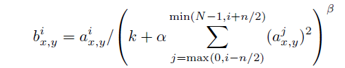 - 1과 2 Convoultion에 추가된 LRN(Locally Response-Normalization Layer)은 에러율을 top-5에서는 1.2%, top-1에서는 1.4% 낮추는 효과를 보였다. 여기서 k=2, n=5, alpha=10^-4, beta=0.75의 파라미터 값을 부여하였다.