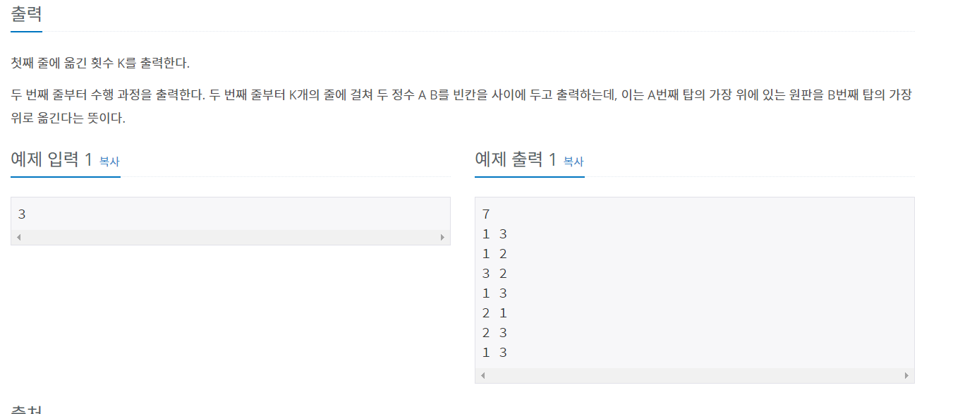 출력 첫 줄에는 총 옮긴 횟수 k를 출력하고, 나머지는 수행 과정을 출력한다. 이때 수행과정은 A 번째 탑에 가장 위에 있는 원판을 B로 옯긴다는 형식으로 표현한다. 즉 예제 출력 1의 1 3은 1번째 탑에 가장 위에 있는 원판을 3번째 탑으로 옯긴다는 뜻이다.