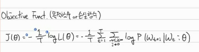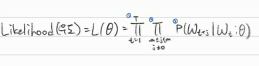 즉, 모든 단어(T)에 대해 fixed size window(m)의 단어(j)만큼 주변 단어의 확률을 곱하면 우도가 산출된다.