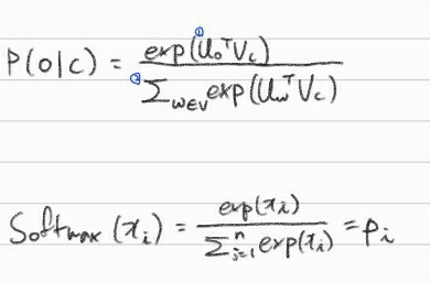 해당 수식은 중심단어가 나왔을 때 주변 단어가 나올 확률로 Softmax 함수와 상당히 유사한 것을 확인할 수 있다. Softmax 함수는 큰 확률을 더 크게 만들고(max) 동시에 여전히 작은 확률에 대해서 약간의 확률을 할당(soft)하기에 softmax라고 불린다. 요컨데, 임의이 값 Xi에 대해 확률분포 값 Pi를 출력하는 것이다.