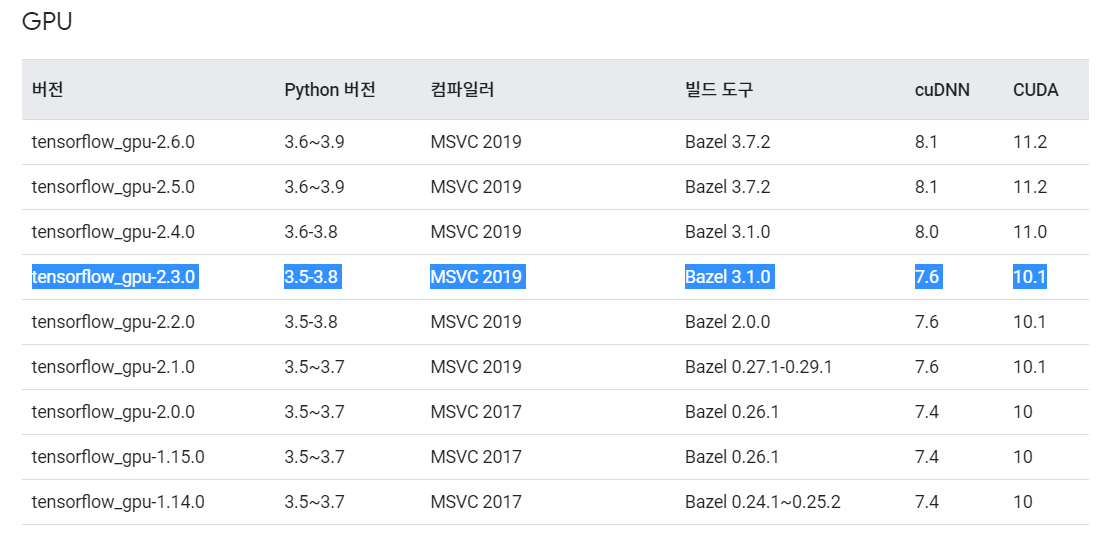 이 중 필자는 하단의 텐서플로우 사이트에서 다운받을 cudnn의 버전을 확인하고 다운받았다.