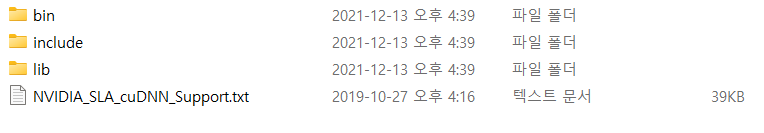 저 드래그 된 cudnn을 누르면 압축파일이 다운된다. 해당 압축파일을 풀면 아래와 같은 파일들이 존재한다.