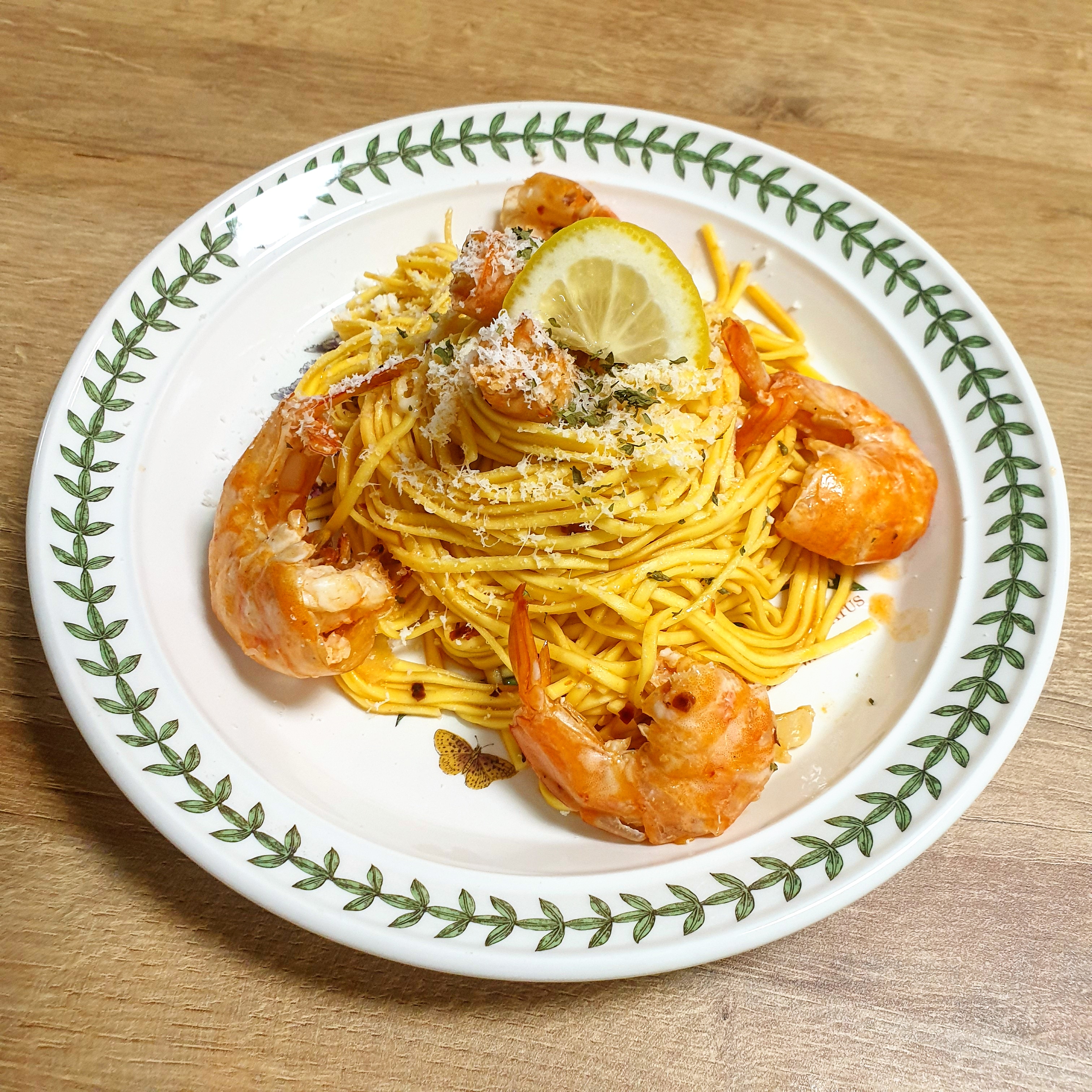 올리브 오일, 생새우 8마리, 마늘 6쪽, 스파게티면 2인분, 칠리후레이크, 소금, 후추, 파슬리, 파르메지아노 레지아노, 버터 15g, 레몬 반개, 청주(화이트와인) 50ml