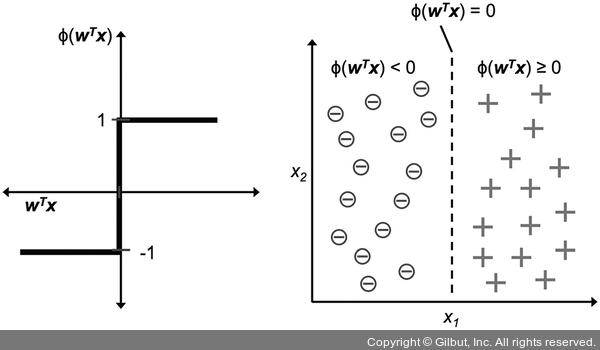 인공 뉴런의 아이디어를 두 개의 클래스가 있는 이진 분류 작업으로 볼 수 있다. 두 개의 클래스는 양성(1)과 음성(-1)으로 나타낸다. 그 후 입력 값 x와 이에 상응하는 가중치 벡터 w의 선형 조합으로 결정 함수(ϕ(z))를 정의한다. 이에 따른 최종 입력인 z는 z = w1x1+...+wmxm이다. 이제 x의 최종 입력이 사전에 정의된 임계 값 θ보다 크면 클래스 1로 예측하고,그렇지 않으면 클래스 -1로 예측한다.