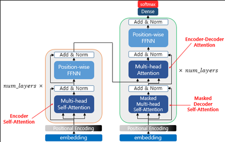 인코더 구조의 첫 번째 단계는 임베딩으로 입력으로 들어온 텍스트를 고정된 차원의 벡터로 변환하는 과정이다. 벡터로 변환된 텍스트에 추가적으로 단어의 순서 정보가 아닌 위치 정보를 파악하여 전달하며 이를 Positional Encoding이라고 한다. 이후 위치 정보가 포함된 벡터화된 텍스트 데이터를 전술한 Self-Attention 레이어를 통해 단어 간의 관계를 학습한 후 피드포워드 신경망(Feed-Forward Neural Network)을 거쳐 각 단어의 특징을 더욱 추상화시킨다. 이 과정을 반복하여 특징을 상세하게 추출하여 텍스트를 인코딩한다. 그 후 인코딩된 텍스트는 디코더를 거쳐 최종적인 텍스트로 나타난다. 디코더의 구조는 기존 인코더 구조에 Maked Self-Attention 레이어가 추가된 형태로, 이 레이어는 현재 위치 이후의 정보를 차단하여 이전 정보에만 집중하도록 하는 역할을 하며 이를 통해 이전 단어만 보고 다음 단어를 예측할 수 있도록 한다. <그림 2>를 보면 Multi-head라는 이름이 붙은 레이어를 확인할 수 있는데 이는 Self-Attention을 여러 개의 head로 나누어 병렬처리하여 더 복잡한 모델링이 가능하게 하는 방법론이다.