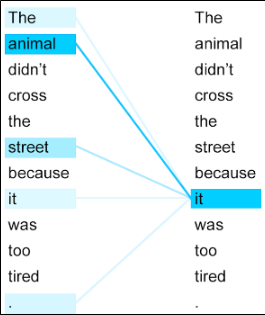 위 그림을 보면 Self-Attetion 매커니즘을 통해 '그 동물은 길을 건너지 않았다. 왜냐하면 그것은 너무 피곤하였기 때문이다.'라는 문장에서 그것(it)에 해당하는 것이 길(street)가 아닌 동물(animal)과 연관되었을 확률이 높다는 것을 찾아낸다.